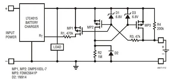 故障狀態(tài)可通過人為操控電路 (在 R1 的頂端和電池充電器輸出之間建立臨時連接) 進(jìn)行演示。然而,普遍認(rèn)為該電路更傾向于連接。如果連接失敗確實成為一個問題,那么可以設(shè)計一款利用多個器件停用電池充電器的電路。圖 12 給出了一個更加完整的電路例子。