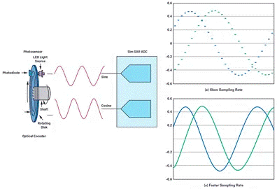 隨著技術(shù)不斷發(fā)展,導(dǎo)致需要實(shí)施高精度位置檢測的電機(jī)控制應(yīng)用不斷創(chuàng)新。光學(xué)編碼器的分辨率可能由圓盤上精細(xì)光刻的槽數(shù)決定,通常有幾百或幾千個。將這些正弦和余弦信號插入到高速、高性能ADC中之后,無需對編碼器圓盤實(shí)施系統(tǒng)變更,即可創(chuàng)建出分辨率更高的編碼器。例如,以更低的速率對編碼器的正弦和余弦信號采樣時,只會捕捉到少數(shù)信號值,具體如圖3所示;這會限制位置電容的精度。在圖3中,當(dāng)ADC以更快速率采樣時,可以獲取更詳細(xì)的信號值,從而更精準(zhǔn)地確定位置。ADC的高速采樣速率支持過采樣,進(jìn)一步改善噪聲性能,消除了一些數(shù)字后處理需求。與此同時,可以降低ADC的輸出數(shù)據(jù)速率;也就是說,支持較慢的串行頻率信號,因此簡化了數(shù)字接口。電機(jī)位置反饋系統(tǒng)安裝在電機(jī)總成上,在某些應(yīng)用中,總成可能非常小巧。所以,能否裝入編碼器模塊面積有限的PCB區(qū)域中,尺寸大小是關(guān)鍵。在單個微型封裝中集成多個通道組件非常有利于節(jié)省空間。