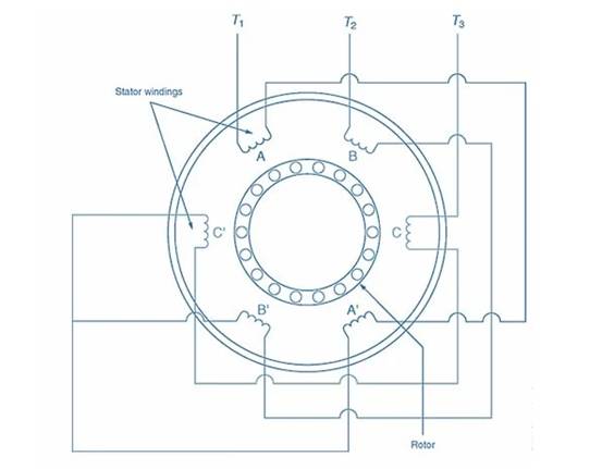 要反轉鼠籠式電機的旋轉方向,只需互換三個定子引線中任意兩個的連接即可。通常,T1 和 T3 可以互換。這將導致定子中的旋轉磁場沿相反方向旋轉。轉子將沿旋轉磁場的新方向轉動,該方向與原始方向相反。