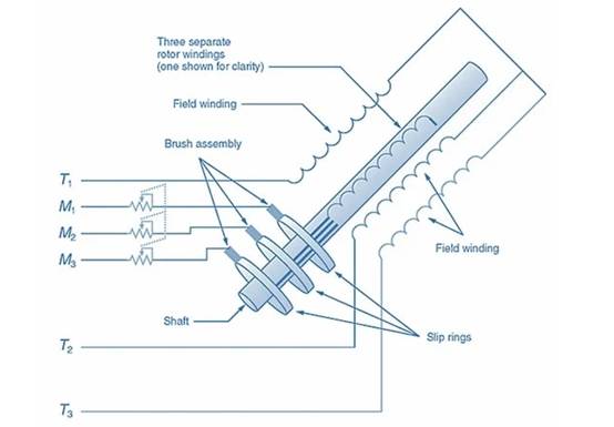 繞線轉子感應電動機由包含繞組的轉子、滑環(huán)、電刷和三相定子組成。圖 4 顯示了繞線轉子感應電機的部件。請注意電機引線的標識,其中定子連接標記為 T1、T2 和 T3,繞線轉子連接標記為 M1、M2 和 M3。圖 4 還顯示了連接到轉子電路中 M1、M2 和 M3 的三相變阻器。