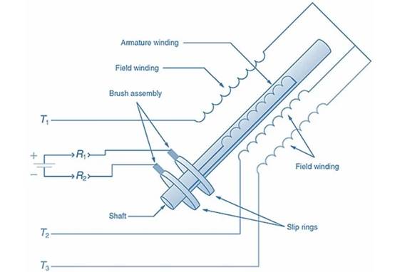 同步電機(如圖 5 所示)具有三相定子、繞線轉子、滑環(huán)和電刷。然而,與繞線轉子感應電機的三個繞組相比,轉子具有單個繞組。轉子還包含類似于鼠籠式電機轉子的短路棒。同步電機引線對于定子連接標記為 T1、T2 和 T3,對于轉子連接標記為 R1 和 R2。直流電源為轉子供電。