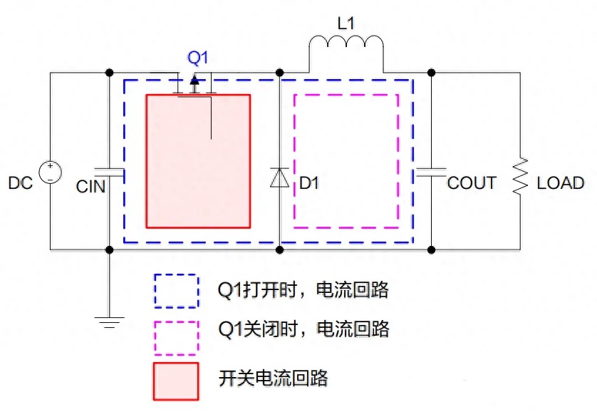 由上圖可知,當(dāng)功率管 Q1 打開時(shí),電流回路是 CIN->Q1->L1->COUT;當(dāng) Q1 閉合時(shí),電流回路是 L1->COUT->D1;