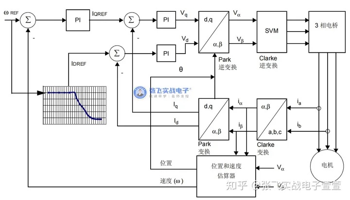 FOC典型控制框圖如下圖四所示。為了得到電機(jī)轉(zhuǎn)子的位置、電機(jī)轉(zhuǎn)速、電流等信息作為反應(yīng),首先需求收集電機(jī)相電流,對(duì)其進(jìn)行一系列的數(shù)學(xué)變換和預(yù)算算法后得到解耦了的易用控制的反應(yīng)量。然后,依據(jù)反應(yīng)量與目標(biāo)值的誤差進(jìn)行動(dòng)態(tài)調(diào)整,最終輸出3相正弦波驅(qū)動(dòng)電機(jī)轉(zhuǎn)動(dòng)。