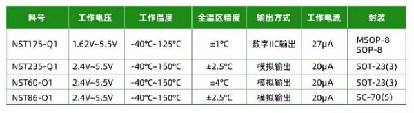 納芯微宣布推出車規(guī)級數(shù)字輸出溫度傳感器NST175-Q1和模擬輸出溫度傳感器NST235-Q1、NST86-Q1、NST60-Q1。這些溫度傳感器采用高性能、高可靠性的CMOS測溫技術(shù),具備全溫區(qū)高精度、高線性度、低功耗和高集成度等特點(diǎn),無需額外電路,且能有效替代無源熱敏電阻,是極具性價比的系列產(chǎn)品。
