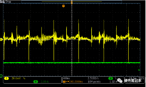 相較圖2,圖3是在相同測(cè)試方法下開(kāi)啟了示波器的帶寬限制測(cè)得的結(jié)果,這樣也只能抑制帶寬之外的瞬變,測(cè)得的依然并非是實(shí)際的紋波狀態(tài)。