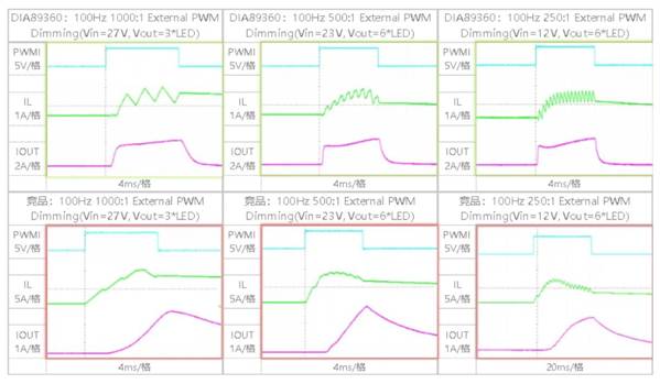 1. 拓展高調(diào)光比應(yīng)用。LED電流路徑中串聯(lián)調(diào)光FET是實(shí)現(xiàn)高調(diào)光比所必需的;當(dāng)PWM信號(hào)為低時(shí),串聯(lián)的調(diào)光FET斷開可以防止輸出電容放電,確保了LED電流能夠?qū)崿F(xiàn)快速的上升和下降,以此來(lái)響應(yīng)高調(diào)光比的PWM輸入,如DIA89360波形;在沒有任何調(diào)光FET的情況下,輸出電容放電,輸出電壓降低,LED電流的建立有一定的延時(shí),如競(jìng)品波形,當(dāng)調(diào)光比高到一定數(shù)值時(shí),LED電流無(wú)法快速響應(yīng)PWM輸入。