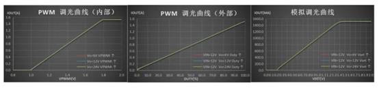 調(diào)光方式靈活,支持模擬調(diào)光,外部PWM調(diào)光和內(nèi)部PWM調(diào)光。內(nèi)部PWM的調(diào)光頻率為280Hz,調(diào)光占空比可通過(guò)改變PWMI引腳的電壓DC值來(lái)調(diào)節(jié),不需要MCU的參與,節(jié)省MCU資源。