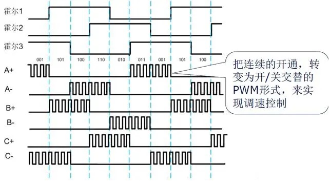 在BLDC電子換相的基礎(chǔ)上,通過更改導(dǎo)通時PWM占空比即可改變等效的輸出電壓, 從而更改來實(shí)現(xiàn)調(diào)速。