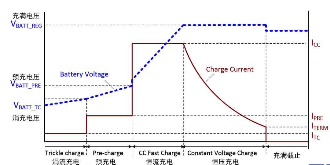 針對(duì)每個(gè)不同的階段,通過分別對(duì)應(yīng)不同電壓的閾值來管理充電過程。