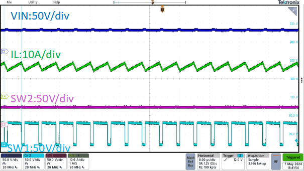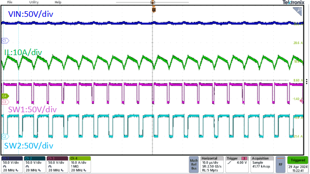 圖5. 800W, Vin=10~60V, Vout=20-55V滿電流條件下穩(wěn)態(tài)波形