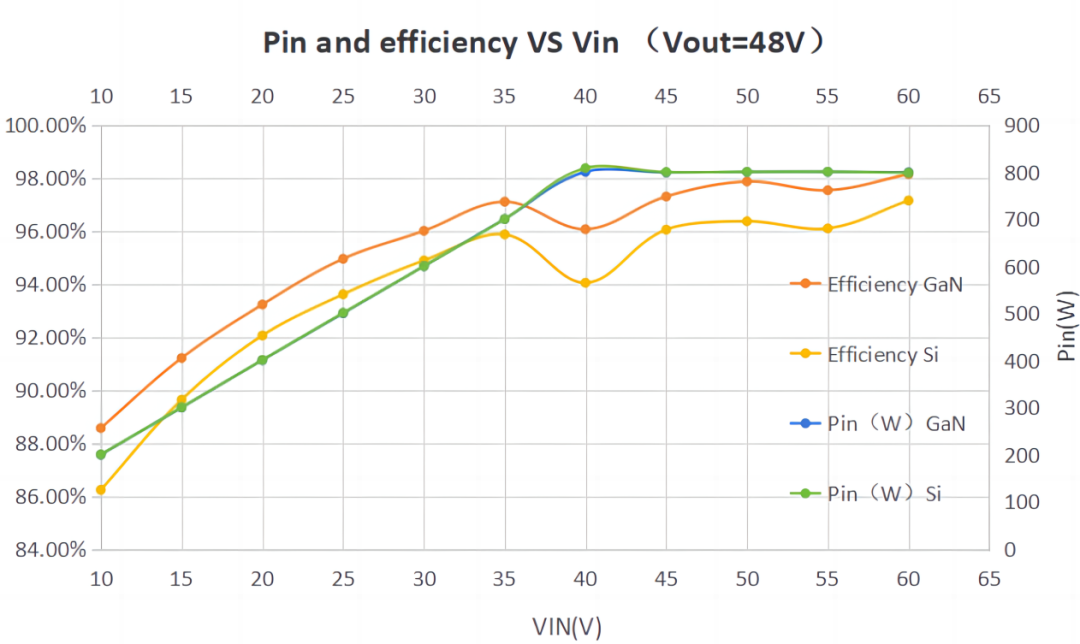圖6. Vin=10~60V,Vout=48V條件滿電流Si和GaN效率對比