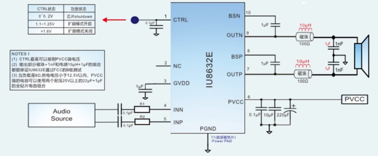 IU8632E內(nèi)置了過(guò)流保護(hù),短路保護(hù)和過(guò)熱保護(hù),有效的保護(hù)芯片在異常的工作條件下不被損壞。IU8632在供電電壓在15V以內(nèi),可以驅(qū)動(dòng)低至4Ω負(fù)載的揚(yáng)聲器,最高可提供22W的連續(xù)功率;在供電電壓16V以內(nèi),可以驅(qū)動(dòng)低至8Ω 負(fù)載的揚(yáng)聲器,提供13W的連續(xù)功率.IU8632具有高達(dá)92%的效率,使得在播放音樂(lè)的時(shí)候不需要額外的散熱器。