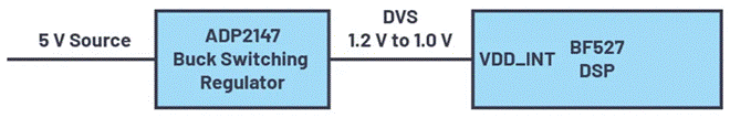 圖2. 具有DVS功能的ADP2147開關(guān)穩(wěn)壓器可實(shí)現(xiàn)ADSP-BF527的高效運(yùn)行。