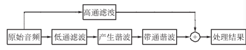心理聲學(xué)實(shí)驗(yàn)中,存在一種“虛擬音調(diào)”的實(shí)驗(yàn)現(xiàn)象:人耳在基頻缺失的情況下利用諧波組合重建信號(hào)音調(diào)高低。主要流程如下圖,產(chǎn)生諧波主要方法為MaxxBass算法和VB Phase Vocoder。