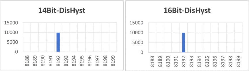 3、 角度精度碼分布集中,噪聲表現(xiàn)良好(10000次測(cè)量,數(shù)據(jù)分布,數(shù)據(jù)長(zhǎng)度均為16bit,圖上標(biāo)的bit數(shù)均對(duì)應(yīng)性能,相當(dāng)于enob)