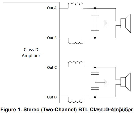 橋接負(fù)載(Bridge-tied load, BTL)是D類放大器最常見(jiàn)的輸出配置。BTL配置由一個(gè)放大器驅(qū)動(dòng)負(fù)載的一側(cè)OutA ,另一個(gè)放大器從第一個(gè)放大器得到反向信號(hào)OutB,驅(qū)動(dòng)負(fù)載的另一側(cè)。相比于單端(SE)電壓相當(dāng)于翻倍,功率P = V*V/R,所以功率最大可以做到相當(dāng)于單端的4倍。
