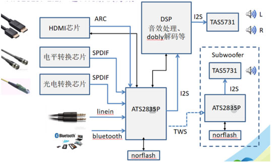 圖示3-大聯(lián)大友尚基于炬芯科技產(chǎn)品的藍(lán)牙音箱方案的方塊圖