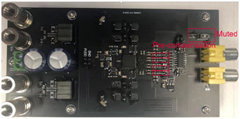 Figure 7 該平臺用于爆裂噪聲評估,V-Meter可以測量直流偏置電壓,Sound meter可以測量來自揚聲器的爆裂噪聲的聲壓。靜音按鈕用于將功率放大器從靜音切換到取消靜音或從取消靜音切換到靜音,Sound meter的麥克風傳感器與揚聲器在同一條線上,Sound meter將測量揚聲器的聲壓級。該平臺設置在靜音室中,然后分別進行有預補償和無預補償?shù)臏y試,數(shù)據(jù)列在以下表格中。