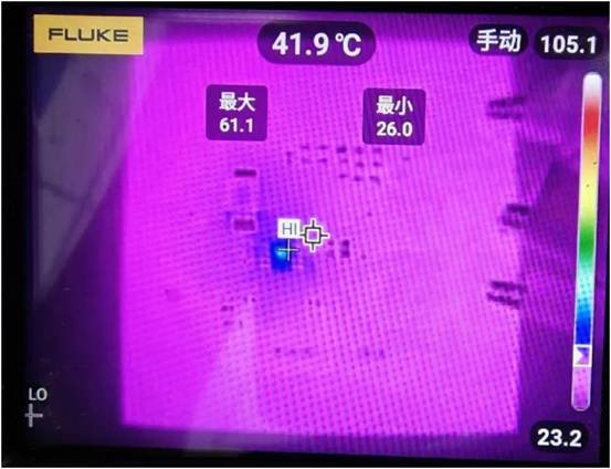 下圖是WD1606S在12V轉(zhuǎn)5V帶載3A的條件下持續(xù)工作1小時(shí)以上的測(cè)試圖片。在環(huán)境溫度25度的情況,芯片最高溫度只有61.1度。