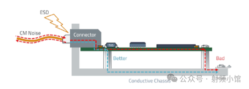 對(duì)于共模發(fā)射,這將作為一個(gè)短路并保持共模環(huán)路小。進(jìn)入的共模電流和ESD都被分流到遠(yuǎn)離電子設(shè)備的地方。請(qǐng)注意,要確保所有這些連接都是低阻抗的。