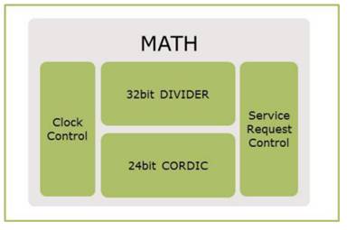 XMC1302中集成一個(gè)MATH協(xié)處理器,它完全獨(dú)立于CPU,工作在PCLK(64MHz)時(shí)鐘下。MATH協(xié)處理包含了一個(gè)32位的DIVIDER和一個(gè)24位的CORDIC。DIVIDER單元實(shí)現(xiàn)32bit有符號(hào)/無符號(hào)除法。CORDIC單元實(shí)現(xiàn)24bit三角函數(shù)運(yùn)算。DIVIDER和CORDIC單元可并行工作,該模塊減輕了CPU的負(fù)荷,對(duì)于實(shí)現(xiàn)無感FOC控制算法提供了良好的支持。