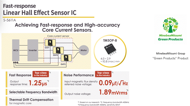 今天推出的新產(chǎn)品「S-5611A」是可編程的高精度線性霍爾效應(yīng)IC,實(shí)現(xiàn)業(yè)界最快速度的1.25μs高速響應(yīng)(※2)和業(yè)界最小等級的0.09μT/√Hz低噪音(※3),可以正確測量微小的電流變動(dòng),有助于提高換流器控制性能。