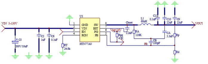 HTN77A0是一個同步降壓轉換器,具有從5V到130V的寬輸入電壓,集成了1.8Ω高側 MOSFET和0.7Ω低端MOSFET。器件帶有0.84A峰值限流,可輸出持續(xù)0.7A。