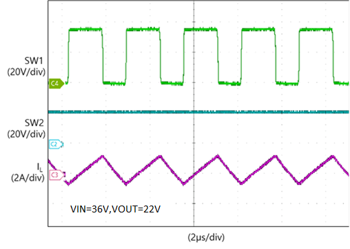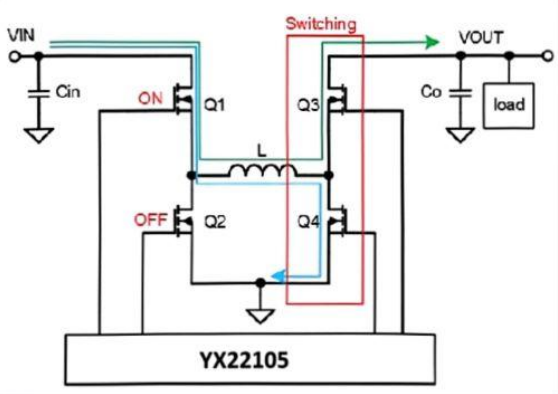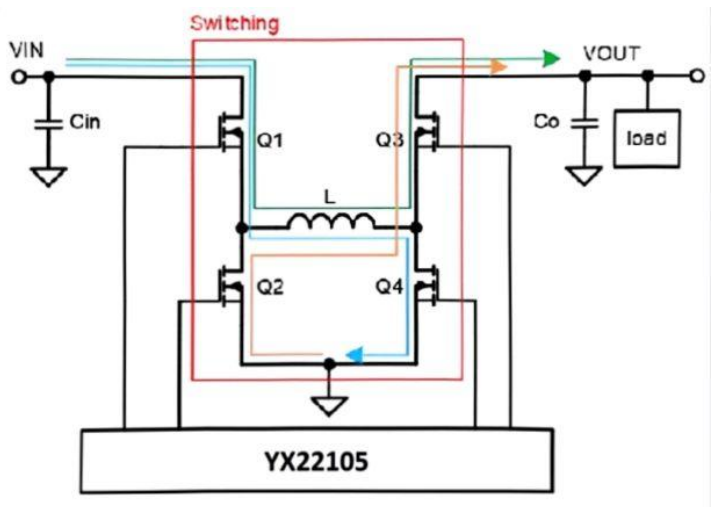 YX22105 能夠根據(jù)輸入輸出電壓自適應(yīng)的進(jìn)入降壓,升壓,升降壓模式;同時保證模式切換時具有優(yōu)異的暫態(tài)性能,使輸出的過沖、跌落風(fēng)險(xiǎn)降到最低。