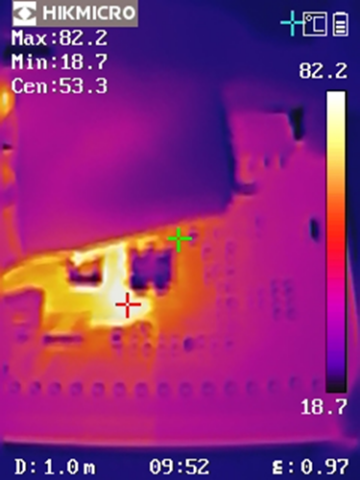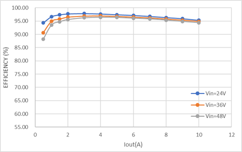 從熱成像圖可以看出,DEMO板在高負(fù)載條件下,溫度分布均勻,沒(méi)有局部過(guò)熱現(xiàn)象。在VIN = 24V, VOUT = 12V, IOUT = 10A 的條件下,最高溫度點(diǎn)為82.2℃,在 VIN = 48V, VOUT = 12V, IOUT = 10A 的條件下,最高溫度點(diǎn)為97.3℃