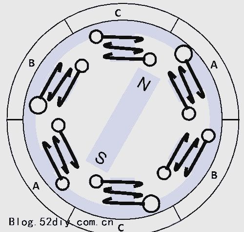 當(dāng)電流通過線圈時,會產(chǎn)生磁場,而磁力線的方向則取決于電流的方向。利用這一原理,如果給線圈A通入電流,它會產(chǎn)生磁場并吸引轉(zhuǎn)子磁鐵,使轉(zhuǎn)子磁鐵沿順時針方向略微偏移并與A對齊。接著,如果依次使電流流過線圈B和C,轉(zhuǎn)子磁體將連續(xù)沿順時針方向旋轉(zhuǎn)。