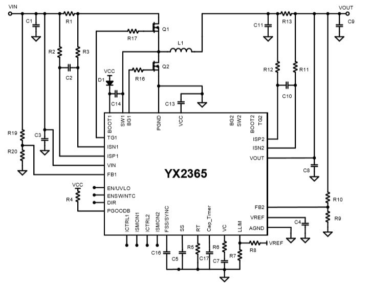 在降壓模式下,它支持高達65V的寬輸入和輸出電壓范圍。YX2365 集 成了具有欠壓鎖定(UVLO)保護的高壓側(cè)和低壓側(cè)柵極驅(qū)動器。它提供可編程的電感器峰值電流限制和輸入/輸出電流限制功能,以及通過ISMON 1和 ISMON2進行實時輸出電流監(jiān)控。CC/CV(恒 流/恒壓) 調(diào)節(jié)功能使其適用于電池充電系統(tǒng)。 此外,YX2365還包括一個外部可編程電池充電定時配置。