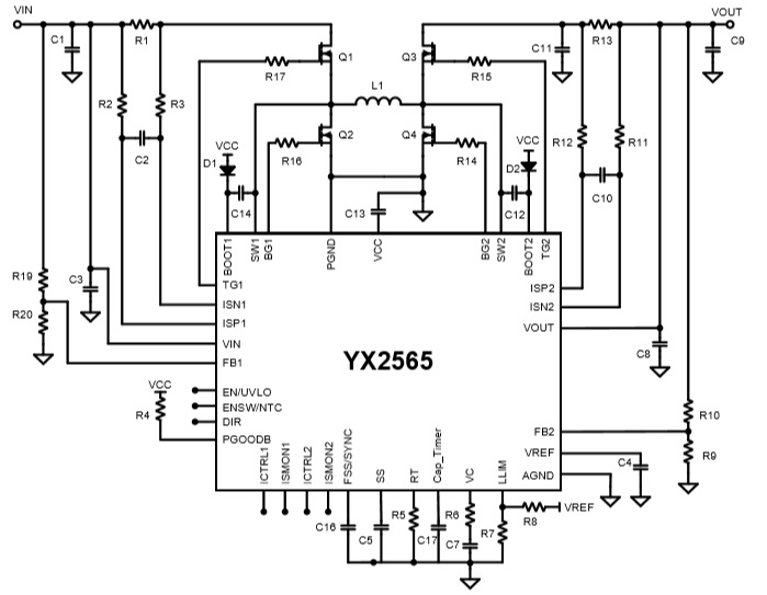 它支持高達(dá)65V的寬輸入和輸出電壓范圍,可在降壓、升壓和降壓-升壓模式之間無縫轉(zhuǎn)換。此外,它還支持雙向工作。YX2565集成了具有欠壓鎖定 (UVLO)保護(hù)的高壓側(cè)和低壓側(cè)柵極驅(qū)動器。 它提供可編程的電感器峰值電流限制和輸入/輸出 電流限制功能,以及通過ISMON1和ISMON2進(jìn)行實時輸出電流監(jiān)控。CC/CV(恒流/恒壓)調(diào)節(jié)功能使其適用于電池充電系統(tǒng)。此外,YX2565 還包括一個外部可編程電池充電定時配置。