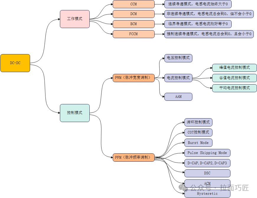 大家好,今天跟大家聊一聊有關(guān)DCDC工作模式和控制模式的基本概念。我們?cè)趯W(xué)習(xí)開(kāi)關(guān)電源的過(guò)程中,經(jīng)常會(huì)遇到各種各樣的概念,比如CCM,DCM,PWM,PFM。。。這些概念種類太多,以至于我們時(shí)常會(huì)產(chǎn)生迷糊,甚至?xí)褍蓚(gè)不同維度的概念放到一起比較,這里我們就來(lái)把它們捋一捋,讓大家能夠更清晰的了解到這些概念的區(qū)別。首先我們來(lái)看一張圖,工作模式和控制模式可以歸納總結(jié)為圖中的幾種方式,下面我們來(lái)逐步把這些模式講清楚。