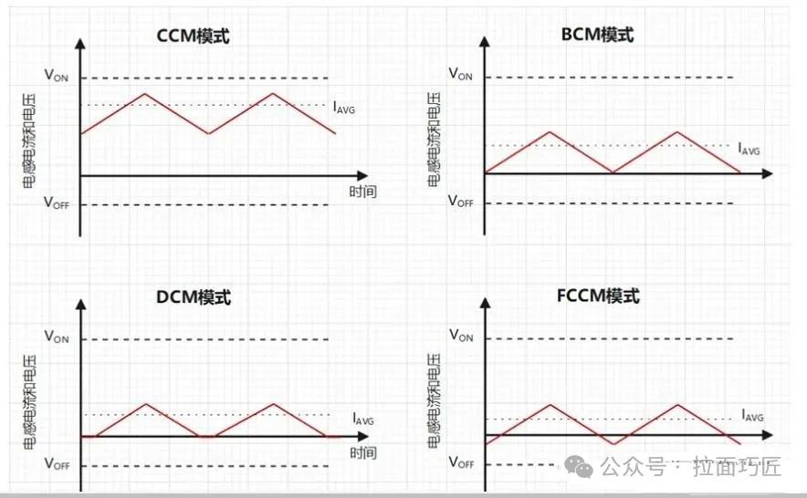 我們知道,任何一個(gè)開(kāi)關(guān)電源最終都會(huì)工作在穩(wěn)定狀態(tài)下,即輸出穩(wěn)定的電壓為負(fù)載供電,但是負(fù)載所需要的能量是動(dòng)態(tài)變化的,既然電壓不能變,那么就需要去控制電感中的電流跟著動(dòng)態(tài)變化,那么就以電感中的電流狀態(tài)劃分了幾種工作模式。通過(guò)圖中我們可以很清晰的看到這幾種工作模式下電感中的電流變化趨勢(shì),