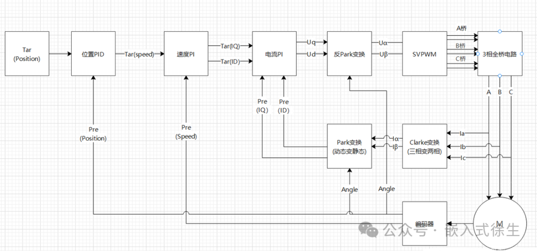 FOC控制無刷電機過程,通過對無刷電機的三相電流采樣進行Clarke變換,將三相正弦電流信號轉換為兩相正弦信號,再經Park變換(旋轉變換),轉換為兩個直流信號作為電流閉環(huán)的輸入,再經反Park變換和空間矢量脈寬調制控制三相全橋的開斷,從而實現(xiàn)無刷電機的控制。