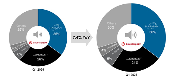 市場(chǎng)研究機(jī)構(gòu) Counterpoint 咨詢(xún)發(fā)布報(bào)告,目前全球乘用車(chē)音響系統(tǒng)市場(chǎng)由 Harman 和 Bose 主導(dǎo),兩家廠商合計(jì)貢獻(xiàn)近 60% 的總銷(xiāo)售額。