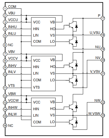 1. 三相全橋智能驅(qū)動架構(gòu)內(nèi)置6顆600V/6A低損耗IGBT及匹配的快速恢復(fù)二極管(FRD),實現(xiàn)高效電能轉(zhuǎn)換,降低開關(guān)損耗。