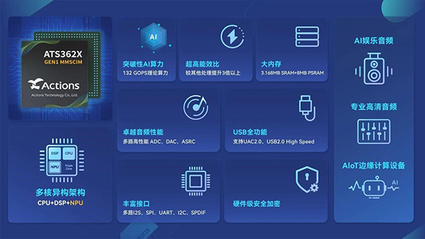 炬芯®端側(cè)AI音頻芯片ATS362X已在品牌客戶音頻產(chǎn)品中立項(xiàng)落地,深度融合低功耗設(shè)計(jì)的深厚積淀與端側(cè) AI 的創(chuàng)新技術(shù),憑借6.4 TOPS/W 的超高能效比,可支持聲紋識(shí)別、環(huán)境音分類等復(fù)雜模型在端側(cè)實(shí)現(xiàn)實(shí)時(shí)推理。這一特性讓音頻設(shè)備在搭載強(qiáng)大 AI功能的同時(shí),仍能維持超長(zhǎng)續(xù)航,輕松滿足全天候使用需求,為各類電池驅(qū)動(dòng)設(shè)備提供穩(wěn)定可靠的性能支撐。