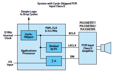 大多數數字放大器接收脈沖編碼調制(PCM)或I2S數據輸入時,需要三根連接線:BCLK、LRCLK和DIN。PCM格式的輸入不需要在處理器側使用調制器或對數據進行上采樣(圖2)。較早的PCM輸入的放大器需要干凈的主時鐘(MCLK)以生成無抖動的采樣時鐘,而較新的PCM輸入的放大器,如MAX98357、MAX98360和MAX98365等,則不再需要MCLK輸入,因此引腳數、功耗和電路復雜度都大大降低。