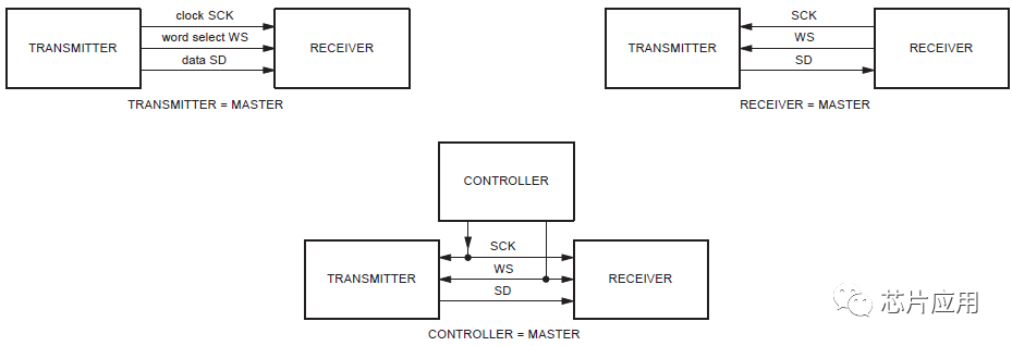 I2S是比較簡(jiǎn)單的數(shù)字接口協(xié)議,沒(méi)有地址或設(shè)備選擇機(jī)制。在I2S總線上,只能同時(shí)存在一個(gè)主設(shè)備和發(fā)送設(shè)備。主設(shè)備可以是發(fā)送設(shè)備,也可以是接收設(shè)備,或是協(xié)調(diào)發(fā)送設(shè)備和接收設(shè)備的其它控制設(shè)備。在I2S系統(tǒng)中,提供時(shí)鐘(SCK和WS)的設(shè)備為主設(shè)備。圖3是常見的I2S系統(tǒng)框圖。