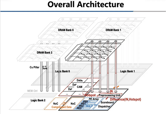 針對諸多行業(yè)挑戰(zhàn),2024年計(jì)算機(jī)體系結(jié)構(gòu)領(lǐng)域頂會(huì)ISCA上,清華大學(xué)集成電路學(xué)院尹首一教授帶領(lǐng)團(tuán)隊(duì),發(fā)表了題為《Exploiting Similarity Opportunities of Emerging Vision AI Models on Hybrid Bonding Architecture》的論文,首次通過混合鍵合技術(shù)實(shí)現(xiàn)邏輯芯片與DRAM的3D可重構(gòu),構(gòu)建了具有超高帶寬的三維DRAM存算一體架構(gòu),從而提升AI芯片算力能效和面積效率。