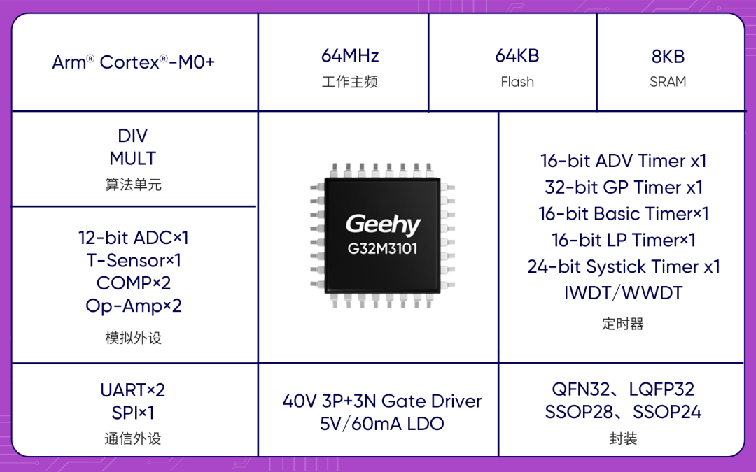 極海正式發(fā)布G32M3101系列高性能、高性價比、高集成電機控制SoC,集成“MCU+LDO+柵極驅(qū)動器”三合一單芯片方案,進一步降低了系統(tǒng)成本和PCB面積,提升系統(tǒng)效率與可靠性。