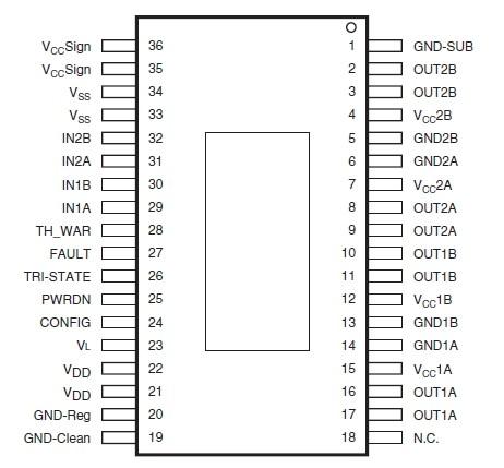 The device is particularly designed to make theoutput stage of a stereo all-digital high-efficiency(FFX) amplifier capable of delivering 100 W +100 W output power into 8-Ω loads withTHD = 10% and Vcc = 39 V. In single BTL