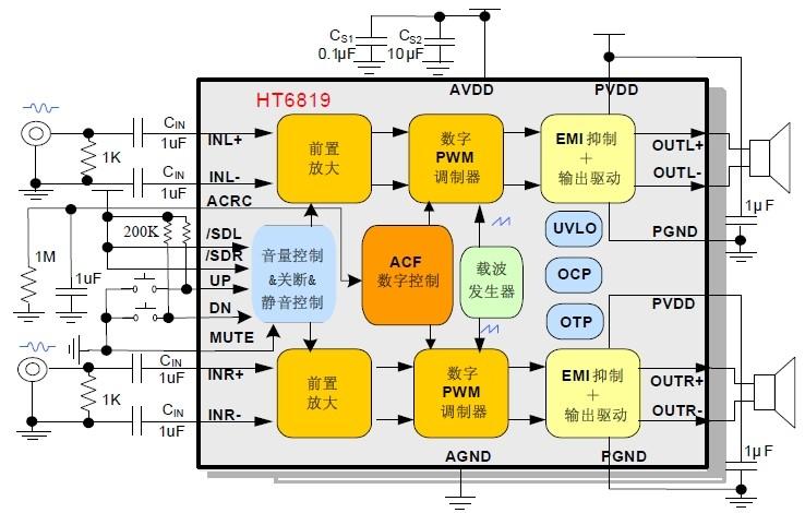 擴頻模式,靜音功能,三種防破音模式,AB/D切換,內(nèi)置升壓,18W單聲道音頻功放 |