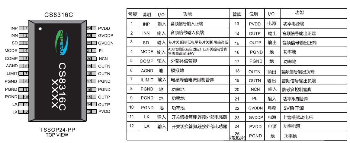 CS8316(雙節(jié)鋰電池7.4V供電內(nèi)置升壓、防破音、AB/D切換、恒定單聲道25W音頻功放IC) |