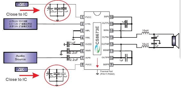 CS8673E內(nèi)置了過流保護(hù),短路保護(hù)和過熱保護(hù),有效的保護(hù)芯片在異常的工作條件下不被損壞。CS8673E可以驅(qū)動低至4Ω負(fù)載的揚(yáng)聲器 ,最高可提供80W的連續(xù)功率;CS8673E具有高達(dá)92%的效率,使得在播放音樂的時候不需額外的散熱器。