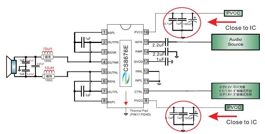 當前位置:首頁->產品展示->功放IC->CS8676(擴頻功能、低空載電流、免輸出電感、2X20W雙聲道/40W單聲道D類音頻功放IC) |