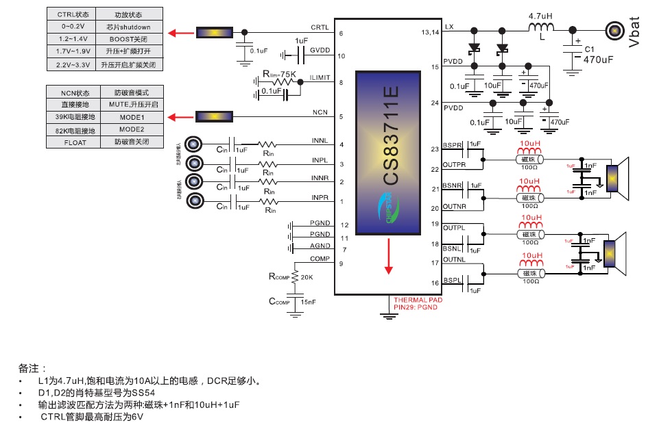 CS83711E的全差分架構(gòu)和極高的PSRR有效地提高了CS83711E對(duì)RF噪聲的抑制能力。無(wú)需濾波器的PWM調(diào)制結(jié)構(gòu)及內(nèi)置的BOOST升壓模塊,以及CS83711E采用專有的AERC(Adaptive Edge Rate Control)技術(shù) ,在音頻全帶寬范圍內(nèi)極大地降低了EMI的干擾,對(duì)60cm的音頻線,在FCC的標(biāo)準(zhǔn)下具有超過(guò)20dB的裕量,另外CS83711E內(nèi)置了過(guò)流保 護(hù),短路保護(hù)和過(guò)熱保護(hù),有效的保護(hù)芯片在異常的工作條件下不被損壞。