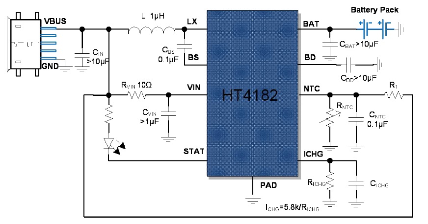 HT4182是一款5V輸入,升壓模式的充電管理IC, 適用于雙節(jié)串聯(lián)鋰電池。 |