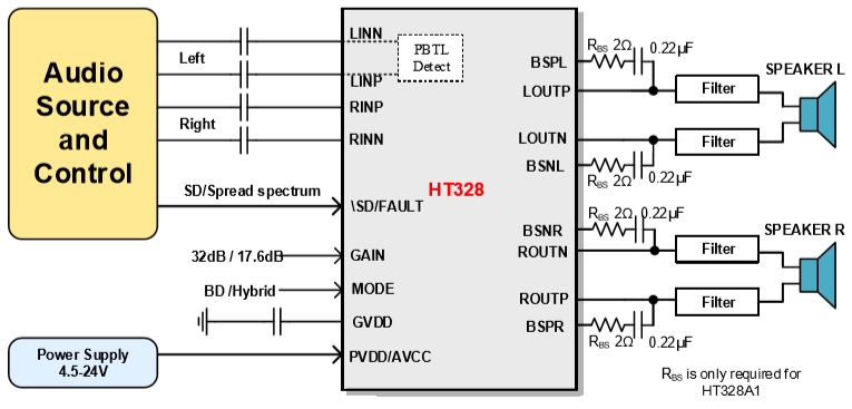 當(dāng)前位置:首頁(yè)->產(chǎn)品展示->功放IC->HT328(30W立體聲/60W單聲道D類功放IC) |